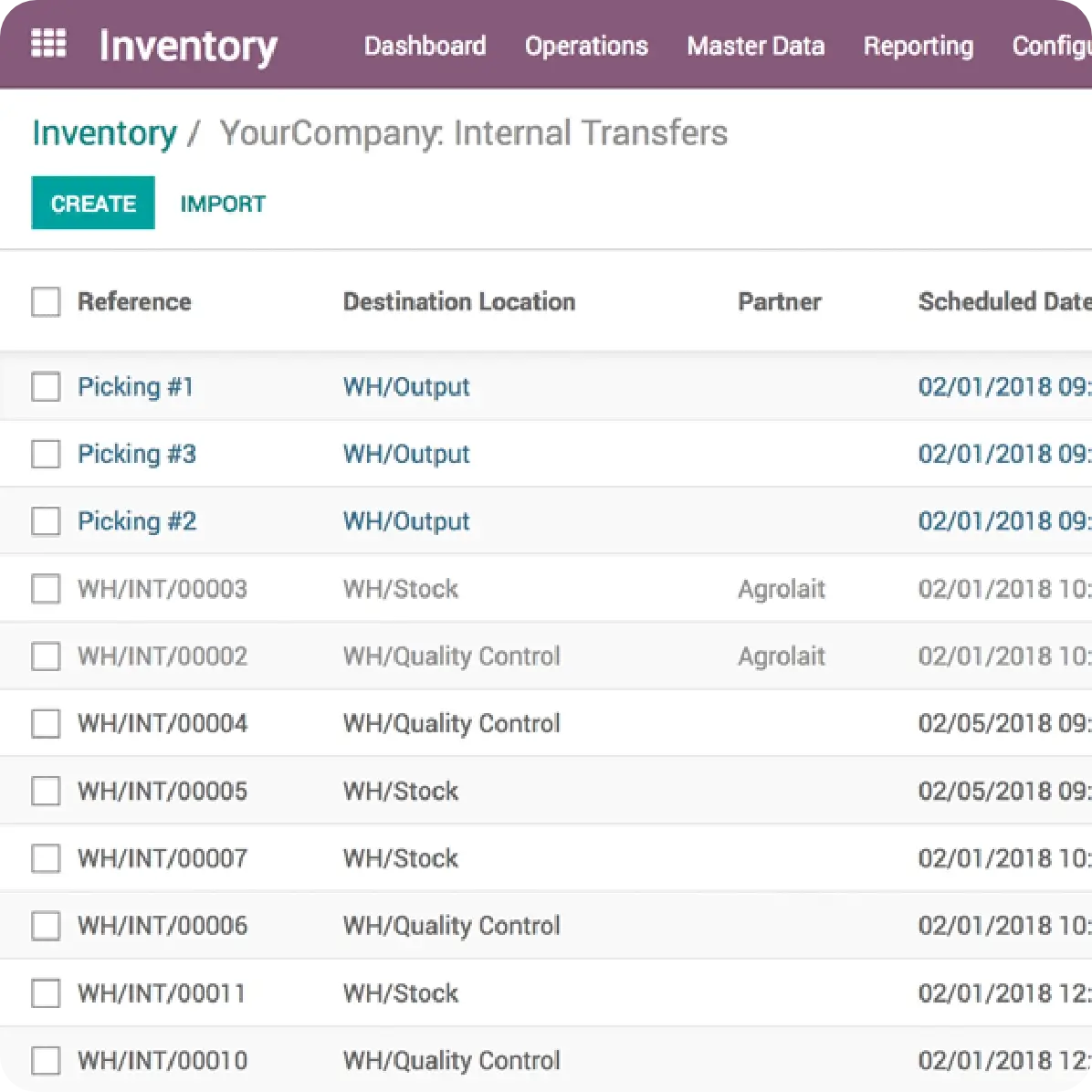 Découvrez la modernité avec le système de gestion d'inventaire d'Odoo. Minimisez les ruptures de stock, fluidifiez les processus, perfectionnez la logistique et bénéficiez d'une transparence complète en temps réel grâce à notre solution avancée pour la gestion des entrepôts.