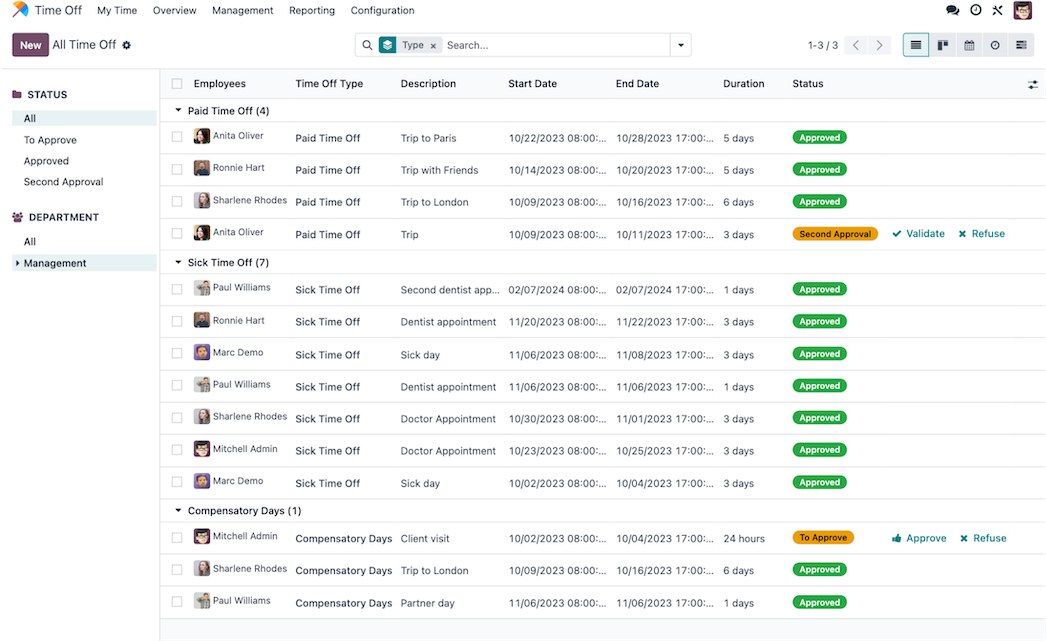 Gérez divers congés tels que les congés payés, maladie, maternité, paternité et sans solde.